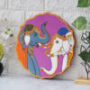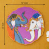 A beautiful pichwai painting of two elephants standing next to each other on a purple plate.